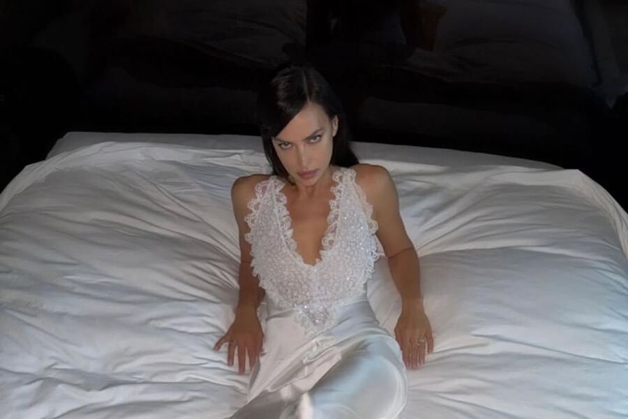 39-летняя Ирина Шейк предстала перед камерой в белой шелковой комбинации, верх которой был украшен кружевом. Супермодель также надела черные лаковые ботинки с шипами и кольца. Манекенщица позировала с уложенными распущенными волосами и макияжем с черными стрелками. Знаменитость была запечатлена на кровати.