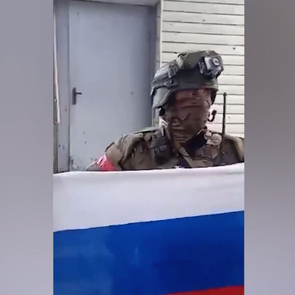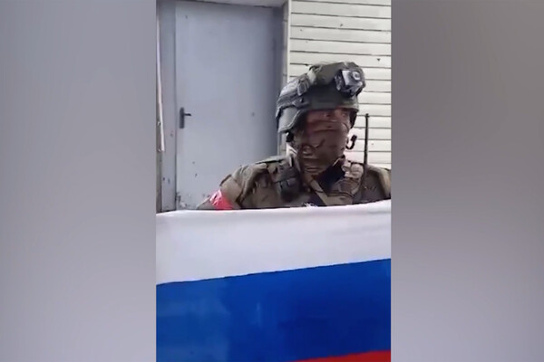 На кадрах видно, как российский боец держит в руках флаг. На следующем снимке отчетливо видны таблички государственных учреждений Рыжевки — местного сельского совета и библиотеки.