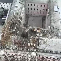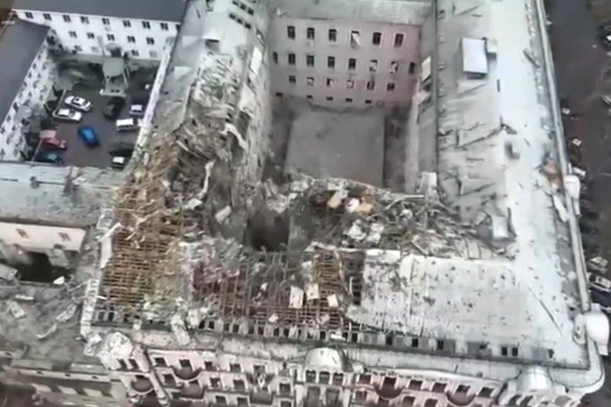 На кадрах видно, что крыша здания сильно повреждена, одна плита верхнего этажа обрушилась, а в здании выбиты окна.