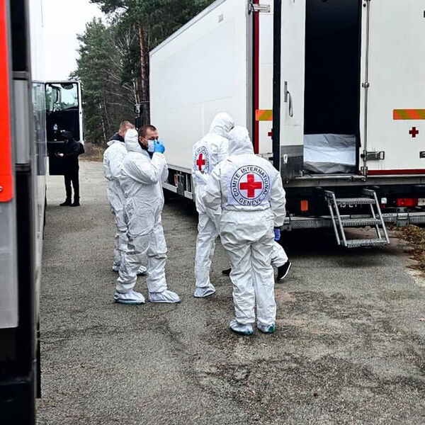 На видео люди в белых защитных костюмах осуществляют перегрузку тел из автомобилей МЧС России в другие грузовики.