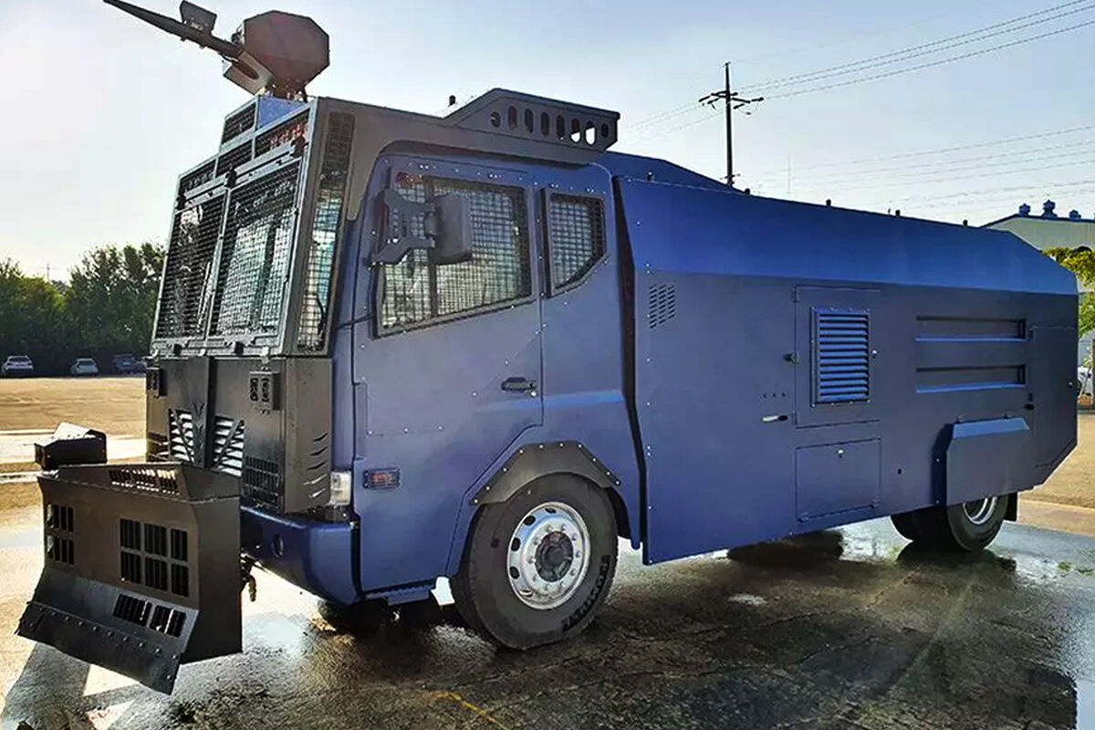 Речь идет о грузовых машинах с водометной пушкой, бьющей на 70 метров. С ее помощью можно впрыскивать пену, слезоточивый газ и краску.