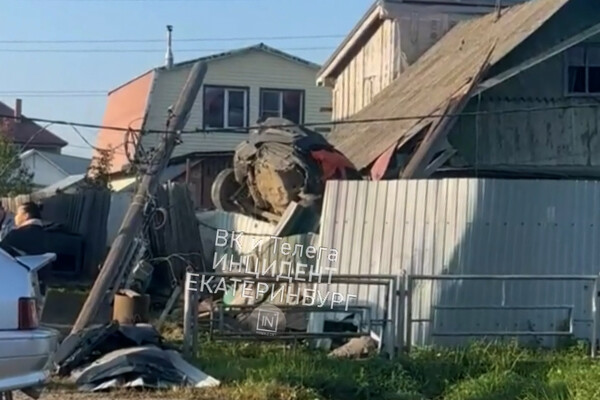 На фото с последствиями ДТП видно, что от удара сильно накренился столб с электропроводами. Повреждена и стена строения за забором.