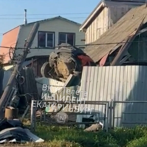 Обломки автомобиля пытаются достать из-за забора с помощью грузовика с краном-манипулятором, уточняет e1.ru в своем Telegram-канале.
