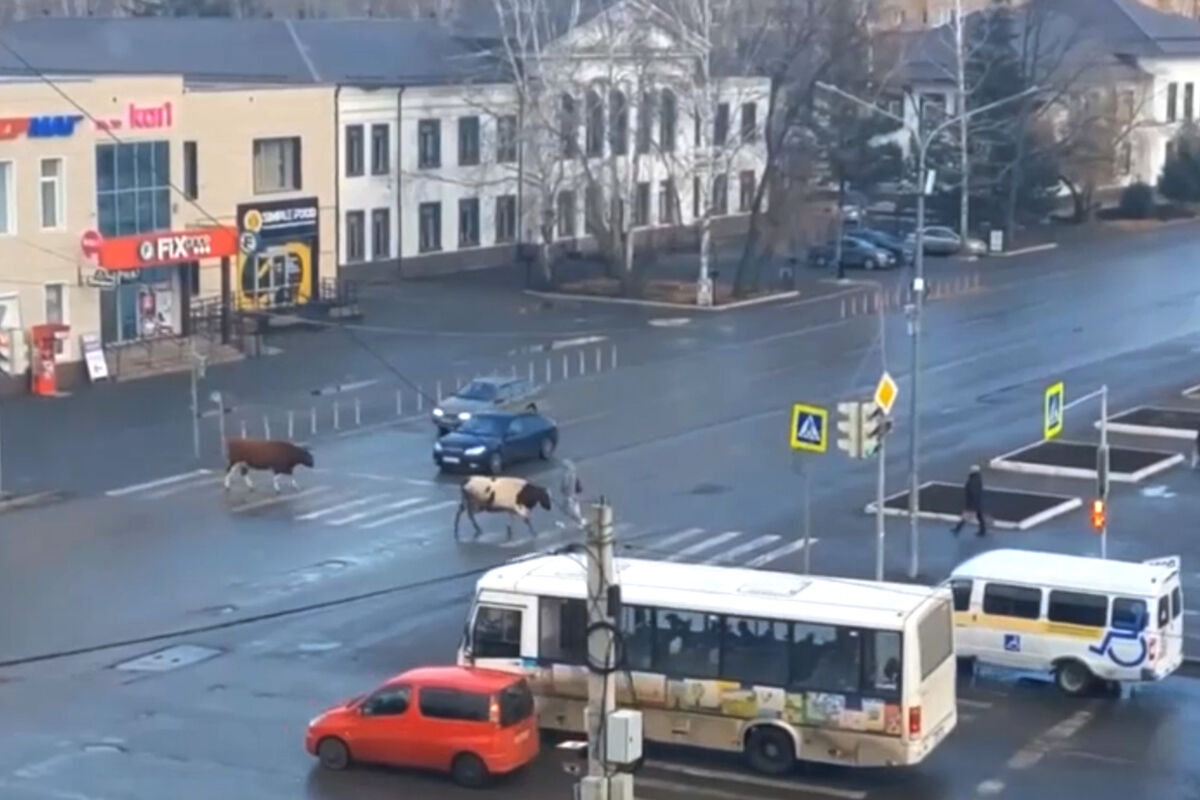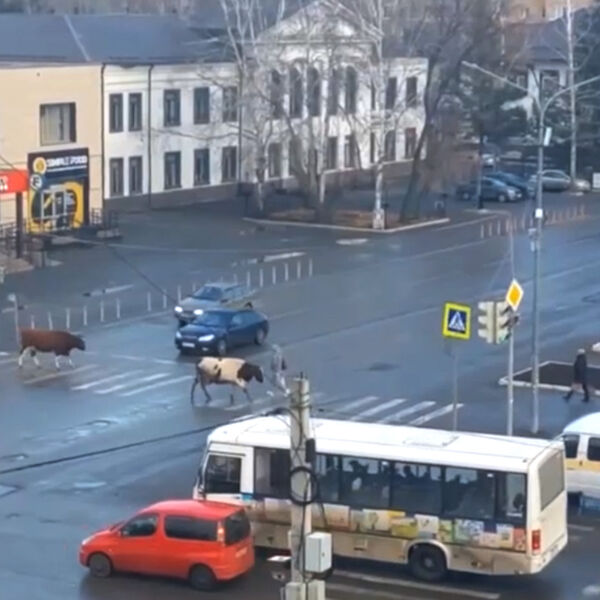 В Назарово Красноярского края две коровы перешли оживленную улицу по пешеходному переходу. Видеозапись с животными размещена в паблике «Запад 24» в соцсети «ВКонтакте».