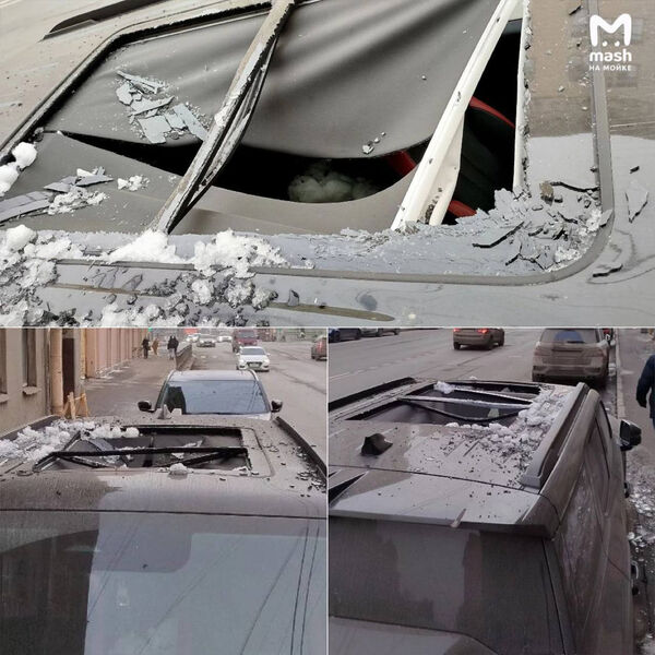 «Беспощадная питерская оттепель, традиционно несущая опасность, испортила утро жителю Васьки — упавшая с крыши дома наледь пробила панорамную крышу авто и вместе с осколками залетела в салон», — говорится в сообщении канала.