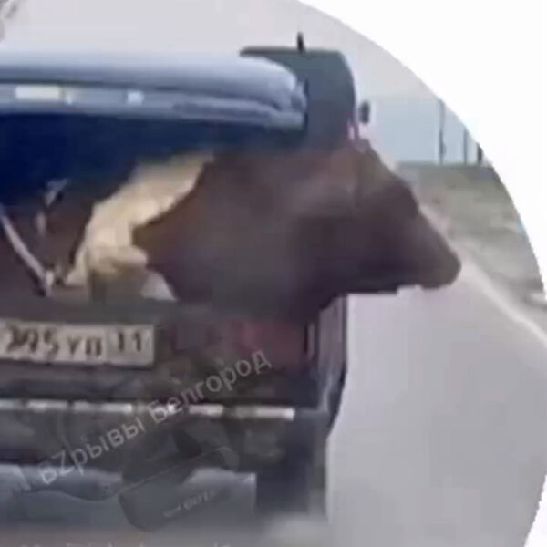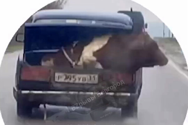 Очевидцы запечатлели инцидент на видео. На кадрах видно, как корова, привязанная веревками, сидит в багажнике движущегося автомобиля. По словам автора видео, у водителя «Жигулей», в которых сидит животное, получается обгонять другие машины.