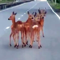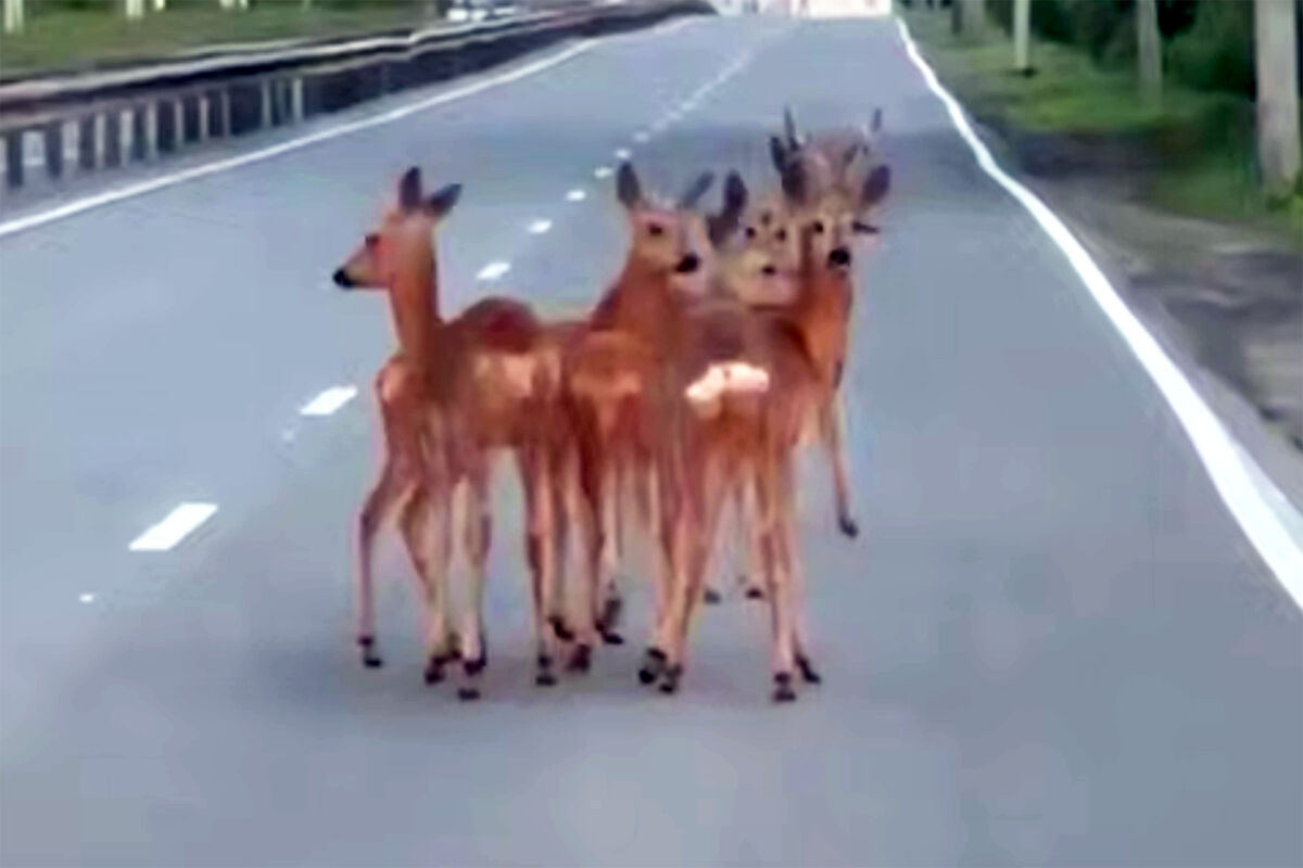 Сотрудники правоохранительных органов запечатлели инцидент на видео. На кадрах видно, как шесть косуль стоят на проезжей части на необорудованном для пешеходов месте.