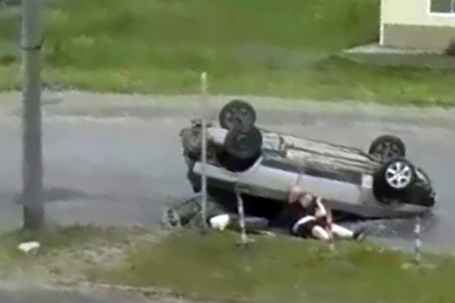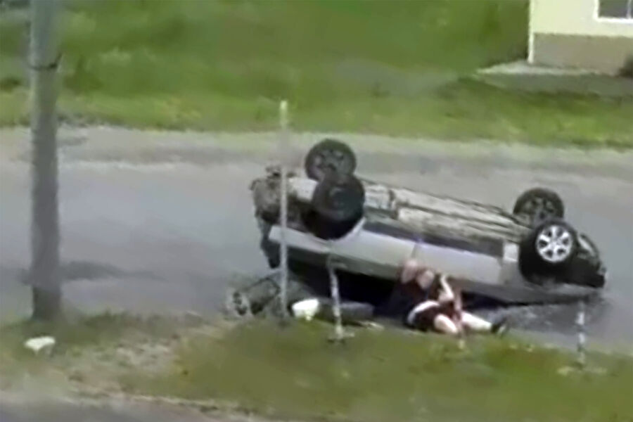 Уличная камера запечатлела инцидент. На кадрах видно, как автомобиль врезается в столб и переворачивается на крышу. После произошедшего водитель выбирается из поврежденной машины и уходит.