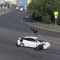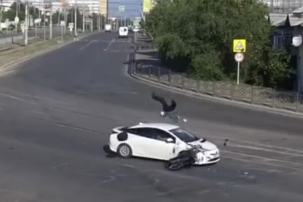 Уличная камера запечатлела инцидент. На кадрах видно, как мотоциклист врезается в автомобиль, от удара водитель подлетает в воздух, переворачивается и приземляется на проезжую часть.