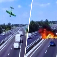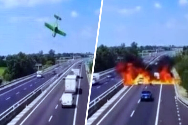 Уличная камера запечатлела инцидент. На кадрах видно, как воздушное судно падает на оживленную трассу и воспламеняется. Проезжающие автомобили быстро отъезжают.