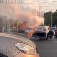 В Краснодаре на видео попал столб дыма, вырвавшийся из опрокинутого авто