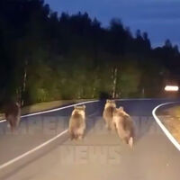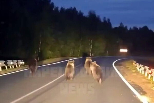 На опубликованных в сети кадрах видно, как четыре медвежонка бегут по проезжей части, после чего убегают в заросли.
