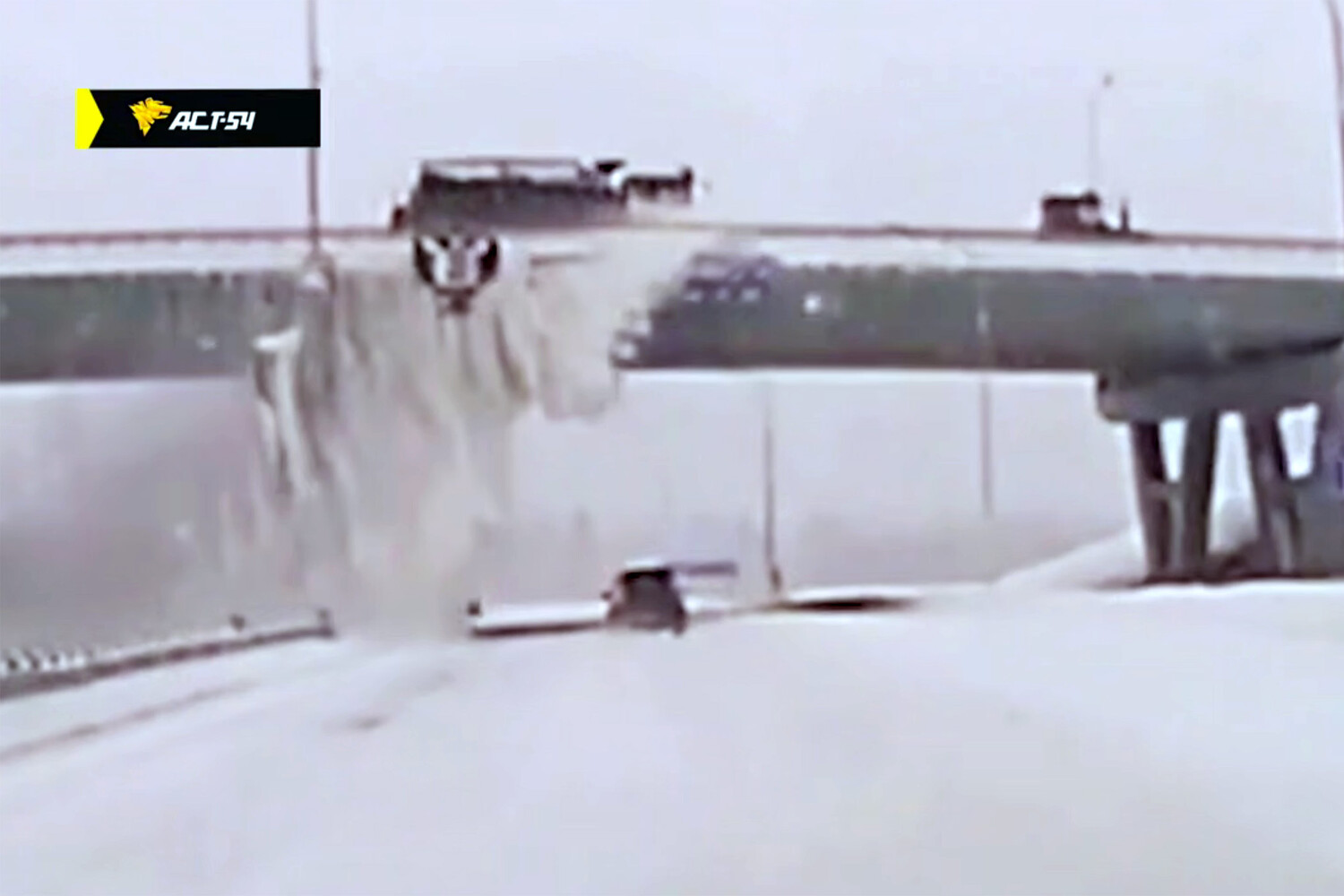 В Новосибирске сняли снегоуборщик, засыпавший грязью автомобиль под мостом
