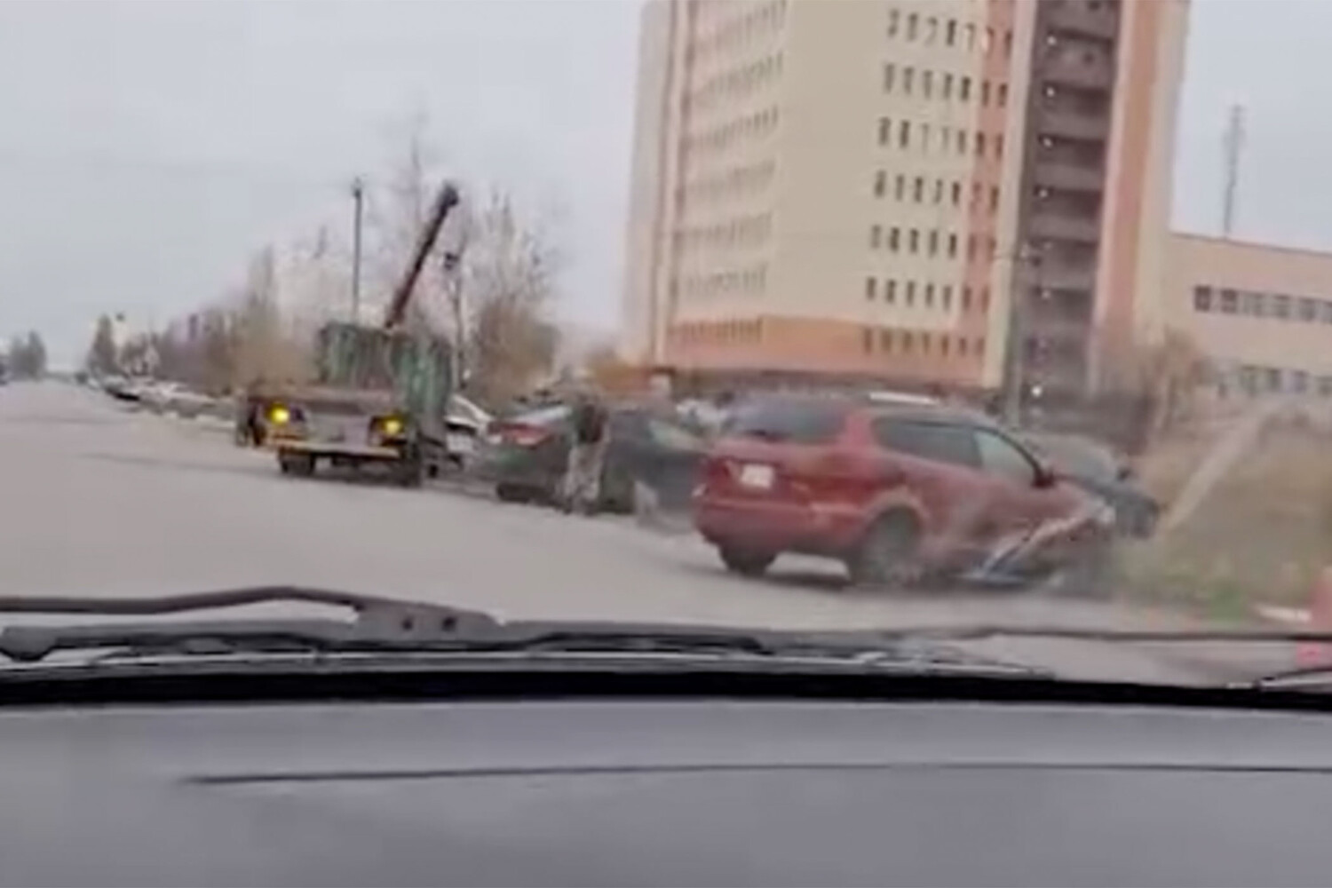 Люди при этом не пострадали. На кадрах с места было видно, что у одного из автомобилей снесло часть кабины, а детали транспортных средств разлетелись по парковке. В беседе с сотрудниками правоохранительных органов 39-летний водитель заявил, что не смог остановиться из-за неисправности.