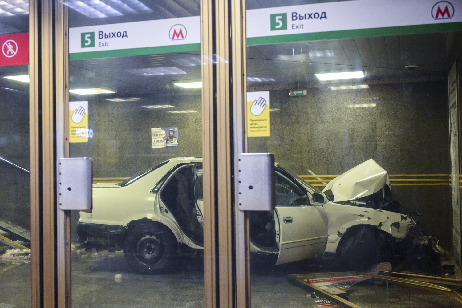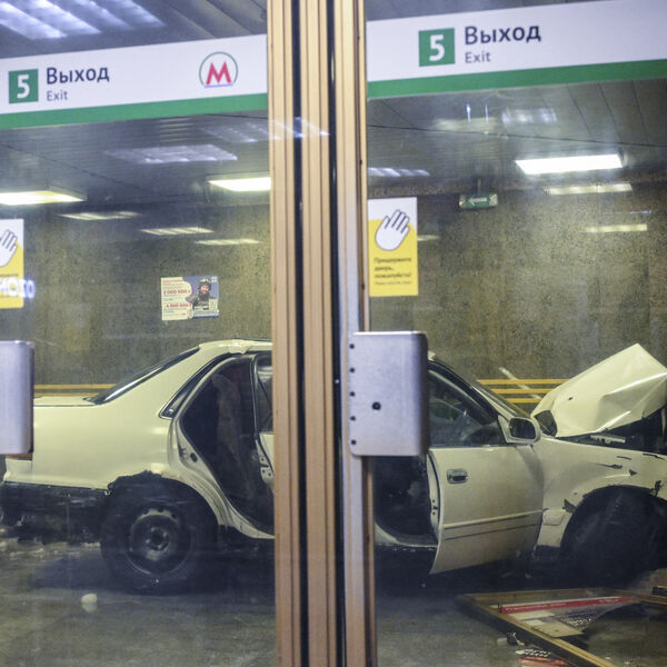 На видеозаписи с камеры наблюдения видно, что из дверей метро выходят два пассажира и сворачивают в сторону. В следующую секунду в здание на высокой скорости врезается автомобиль. Входной павильон станции получил значительные повреждения.