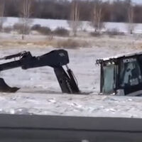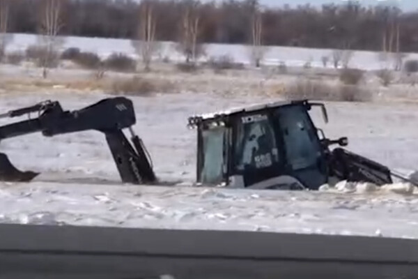 На кадрах с места происшествия видны два экскаватора-погрузчика и грейдер, оказавшиеся в воде, их колеса не видны под поверхностью льда. Рядом находятся люди, которые безуспешно пытаются извлечь тяжелую технику.