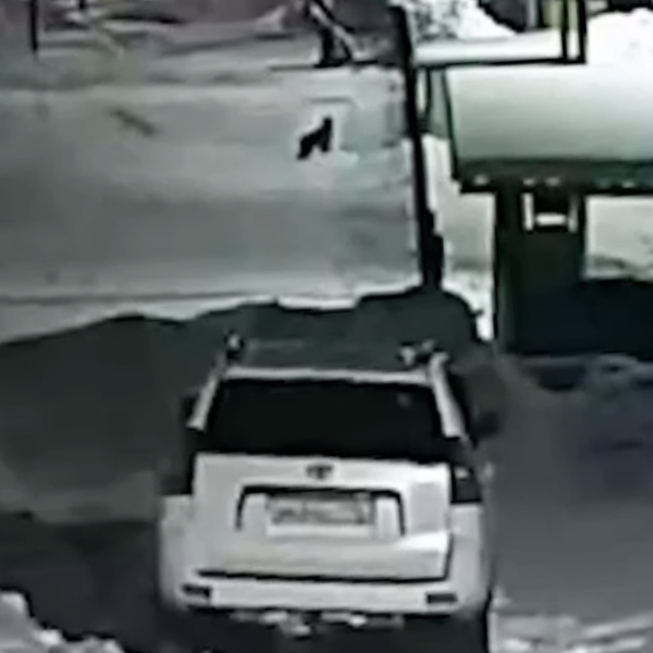 Уличная камера запечатлела инцидент. На кадрах видно, как животное бежит по заснеженной дороге, после чего обходит припаркованные автомобили.