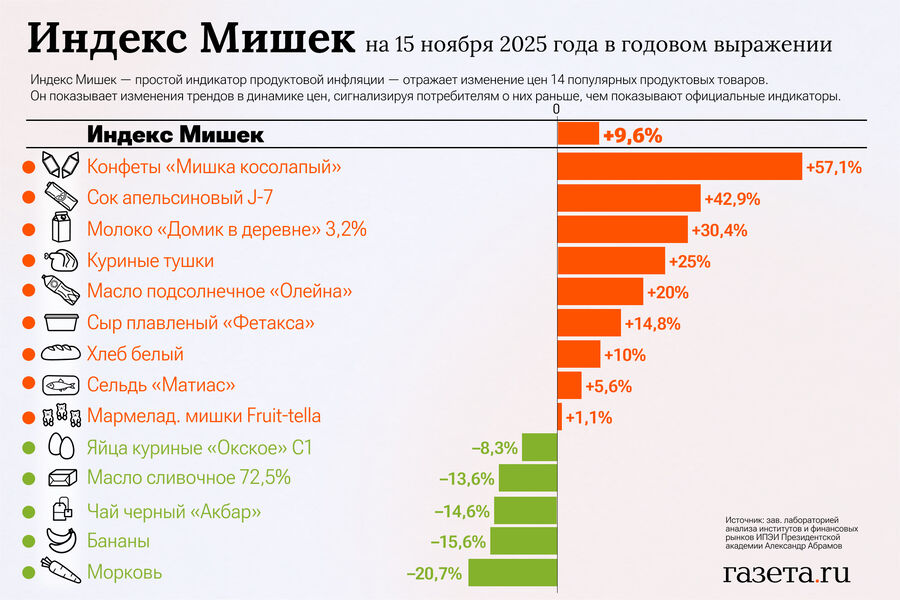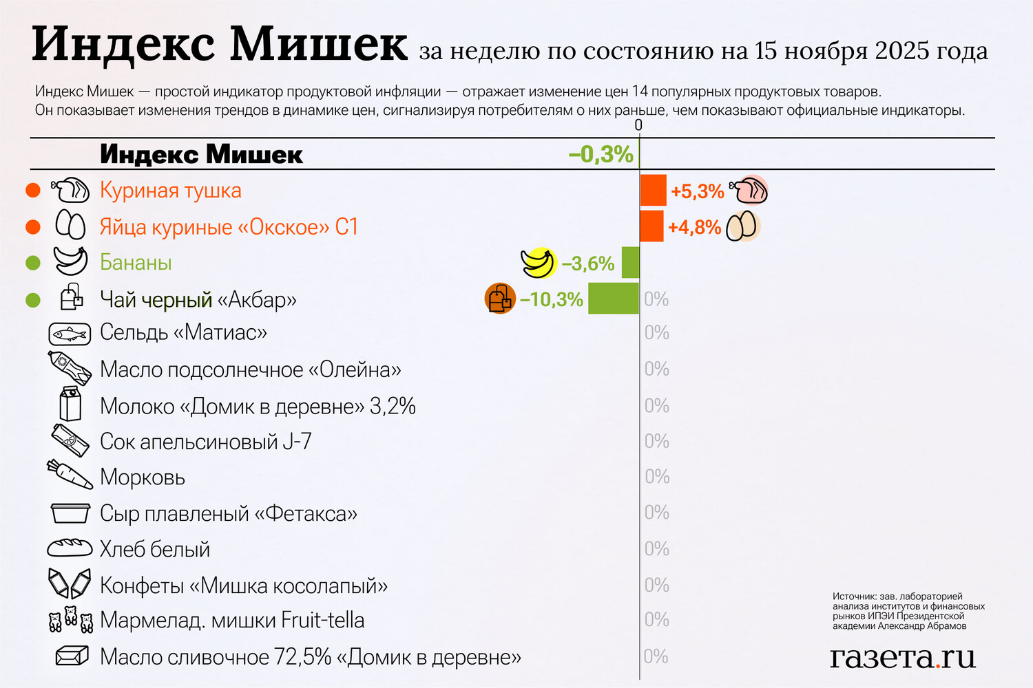 «Значение Индекса Мишек снизилось на 0,3% по сравнению с его нулевым изменением неделю назад. За неделю уменьшились цены на чай черный «Акбар» (-10,03%) и бананы (-3,6%). Выросли цены куриные тушки «Каждый день» (+5,3%) и на яйца Окские категории С1 (+4,8%). Цены остальных товаров в индексе не изменились. В годовом выражении значение Индекса Мишек выросло на 9,6% по сравнению с его ростом на 12,4% неделю назад», — отметил Абрамов.