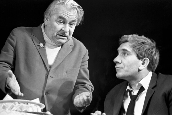 Актеры Владимир Всеволодов (слева) и Армен Джигарханян в спектакле «Дым Отечества» на сцене Московского театра имени Ленинского комсомола, 1967 год