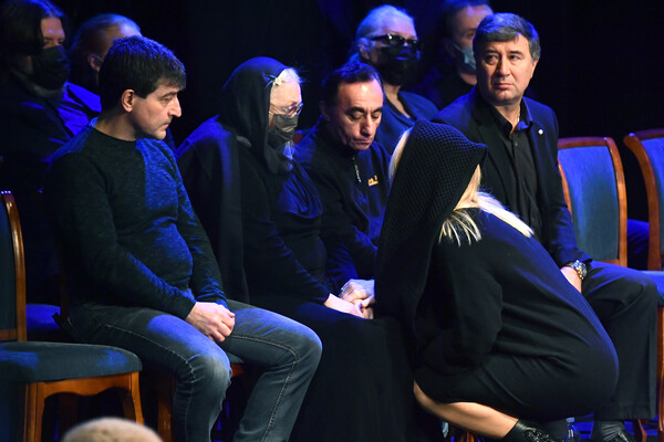 Сын Армена Джигарханяна Степан и бывшая супруга Армена Джигарханяна Татьяна Власова (слева направо) на церемонии прощания с Арменом Джигарханяном в Московском драматическом театре под руководством Армена Джигарханяна в Москве, 2020 год