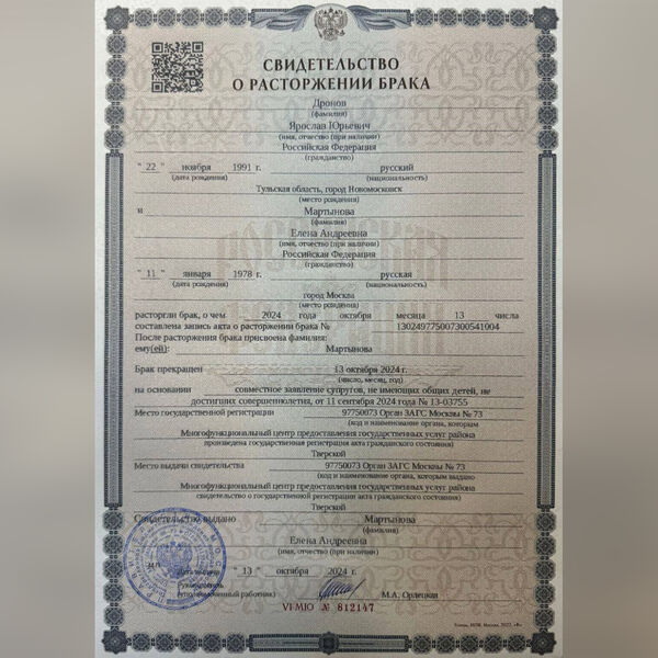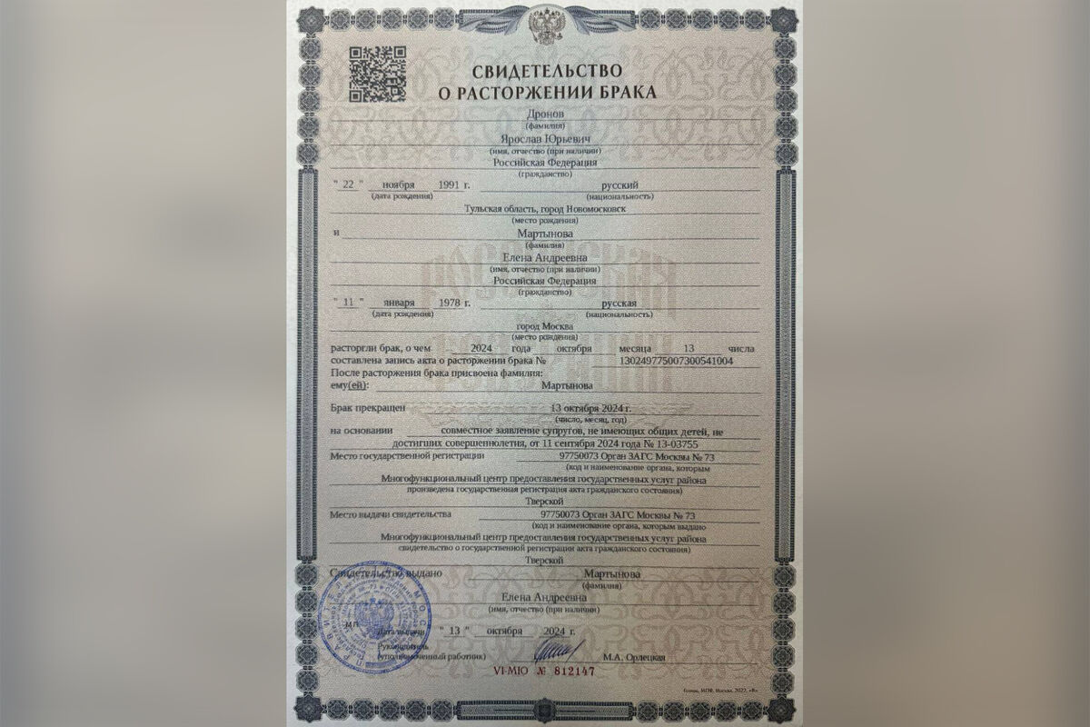 Дронов опубликовал свидетельство о расторжении брака. Союз был прекращен 13 октября 2024 года.