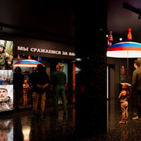 Арт-объект под названием «Зонт мира» выставлен в зале музея, посвященном российской специальной военной операции на Украине. Зонт, раскрашенный в цвета флага России, защищает от бомб, похожих на флаги США, ЕС, Третьего рейха и сообщества ЛГБТ.