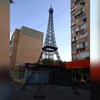 10-метровая миниатюра Эйфелевой башни, оригинал которой установлен в столице Франции Париже, напомнил градоначальник, была выполнена в 2000-х художником-кузнецом Сергеем Михайловым. Башню и массивные стулья он изготовил по заказу владельца кафе во французском стиле.