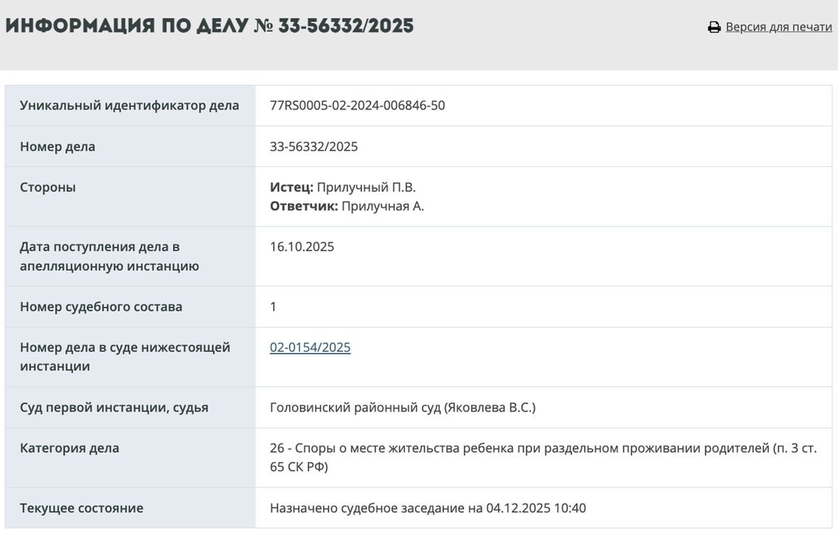 Судебное заседание пройдет в Московском городском суде. Павел Прилучный выступает истцом, а Агата Прилучная — ответчиком. Слушание назначили на 4 декабря 2025 года в 10:40.