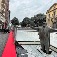 Статуя, изображающая маэстро в концертном костюме с распростертыми объятиями, оказалась посреди будущего рождественского катка — сейчас она по колено утопает в деревянных конструкциях, установленных на центральной площади города.