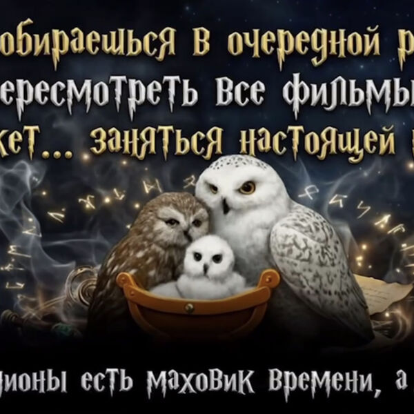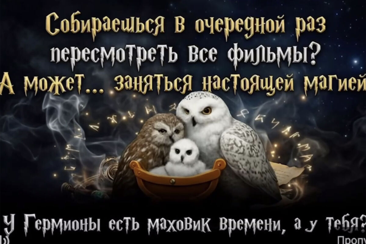 Зрителям вместо просмотра «Гарри Поттера» предлагают заняться «настоящей магией», демонстрируя семью сов, нарисованных в стилистике фильмов, предположительно, с помощью ИИ.