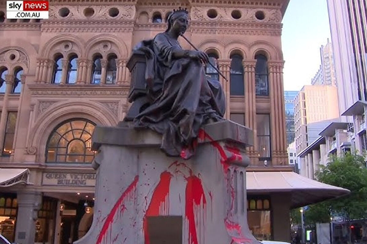 В публикации уточняется, что акт вандализма был совершен минувшей ночью. Неизвестные облили красной краской статую королевы Виктории, установленную в центре Сиднея у «Дома королевы» (Queen Victoria Building) на углу Джордж и Друитт-стрит.