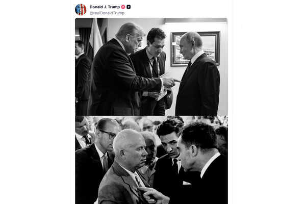 Президент США Дональд Трамп опубликовал свое фото с президентом России Владимиром Путиным на Аляске вместе с фото бывшего главы американского государства Ричарда Никсона с советским лидером Никитой Хрущевым. Публикация доступна в соцсети Truth Social.