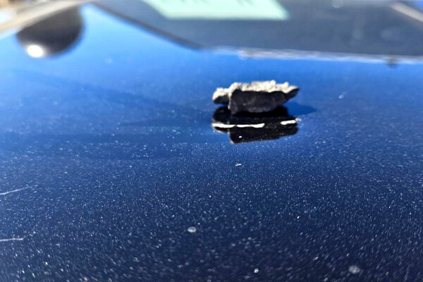 На фотографии видно, что в результате падения осколка на патрульном автомобиле осталась небольшая вмятина и царапина.