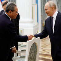 Путин обменялся с Ли Цяном рукопожатием, приняв его в Представительском кабинете Сенатского дворца в Кремле.