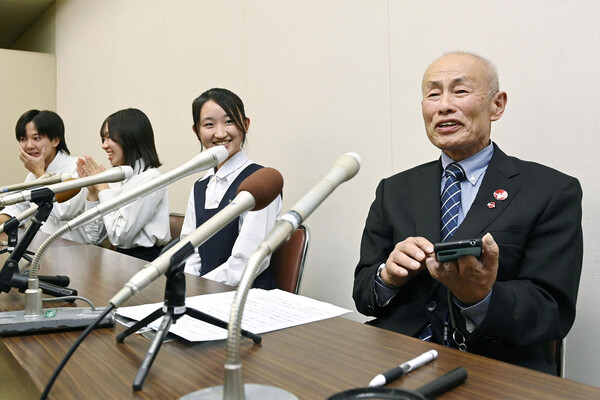 Сопредседатель организации «Нихон Хиданкё» Тосиюки Мимаки, переживший атомную бомбардировку Хиросимы в 1945 году, во время пресс-конференции после вручения организации Нобелевской премии мира, Хиросима, Япония, 11 октября 2024 года