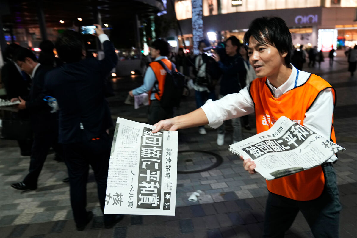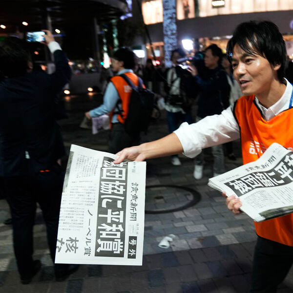 Сотрудники газеты Yomiuri Shimbun раздают выпуск с новостью о том, что японская организация «Нихон Хиданкё» получила Нобелевскую премию мира, Токио, Япония, 11 октября 2024 года