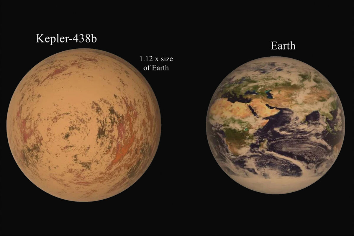 Kepler-438 — это красный карлик в созвездии Лиры примерно в 470 световых годах от Земли. Эта звезда вдвое легче Солнца и в 10 раз его тусклее, но Kepler-438b вращается вокруг нее на орбите вшестеро меньшего радиуса, чем земная. Масса планеты и радиус близки к земным. Температура ее поверхности должна быть около 3°C, что допускает существование жидкой воды и сложных углеводородных соединений. Длина года составляет 35 земных дней и 5 часов, а длительность суток, вероятно, бесконечна из-за нахождения планеты в приливном захвате (подобно тому, как Луна все время повернута к Земле одной стороной). Короткий год формально не портит пригодность для жизни, а вот бесконечные сутки считаются негативным фактором.