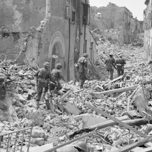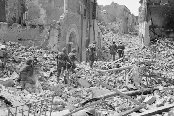 Британские войска наступают через разрушенный город Арджента в апреле 1945 года