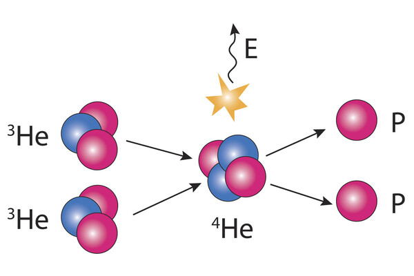 Это слияние происходит не как у капель воды, а за счет ядерной реакции, в ходе которой из двух протонов образуется ядро тяжелого водорода, состоящее из протона и нейтрона. Ядро тяжелого водорода затем вступает в реакцию с другим протоном и образует гелий-3, а два ядра гелия-3 при слиянии дают конечный продукт — привычный нам гелий-4.