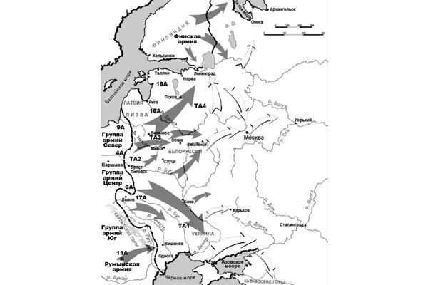Исходя из этой предпосылки и строился весь план «Барбаросса». При взгляде на него с сугубо военной точки зрения он выглядел чистой воды авантюрой. По задумке его составителя в окончательном варианте, подполковника Лоссберга, необходимо было создать три стратегические группировки — две в Восточной Пруссии для действий севернее Припятских болот и одну в Румынии, для завоевания Украины при помощи румынских сил. В стратегическом масштабе удар наносился по трем расходящимся направлениям: на Ленинград, на Москву и в сторону Донбасса-Кубани. Это был классический удар растопыренными пальцами, шедший вразрез с извечным военным принципом концентрации сил.