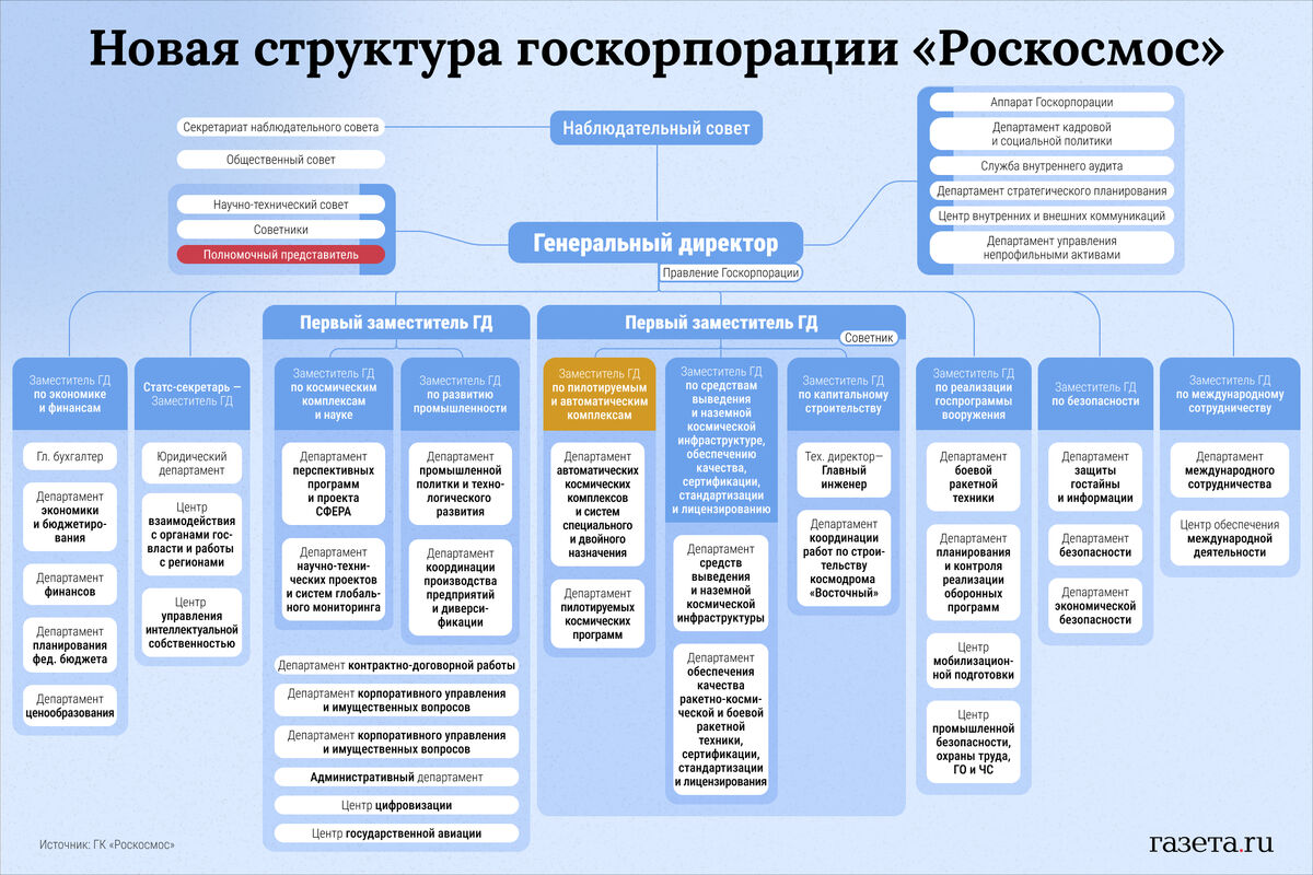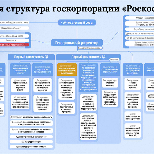 С первого августа 2024 года вступил в силу приказ об учреждении новой организационной структуры госкорпорации «Роскосмос», схема которой попала в распоряжение «Газеты.Ru».