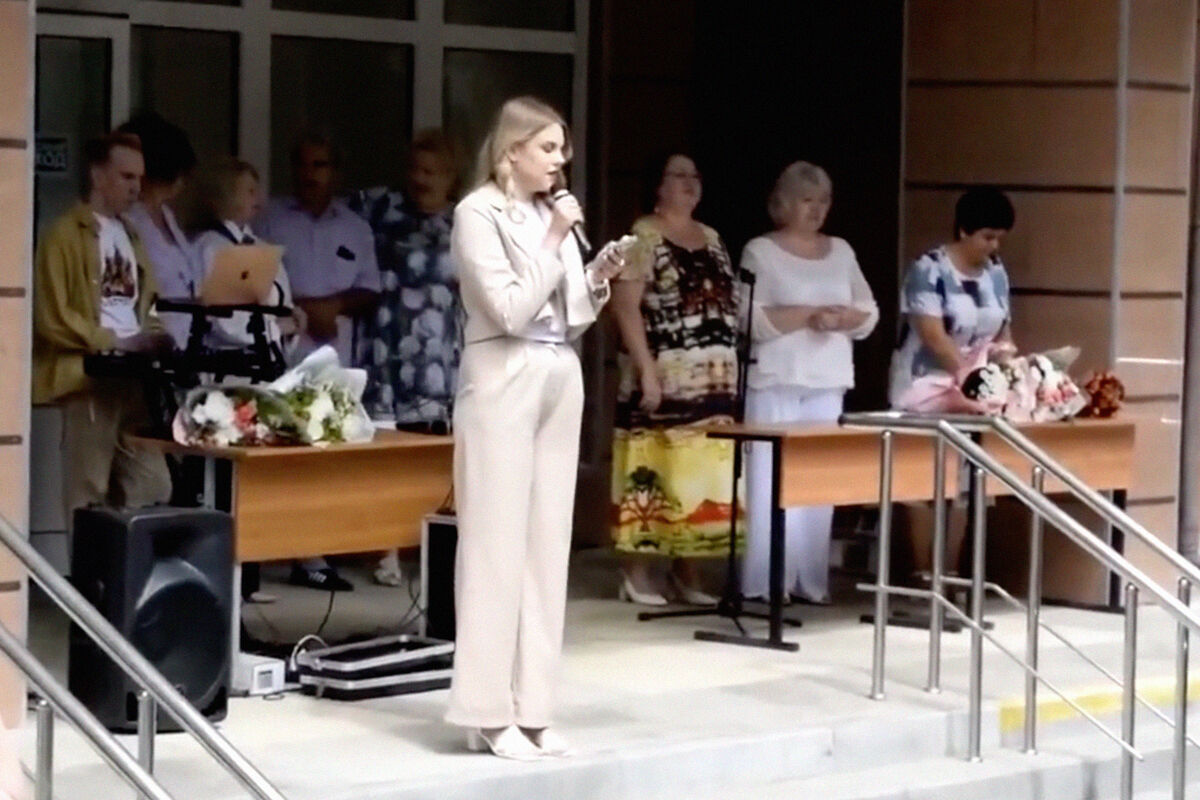 На записи девушка стоит в брючном костюме на крыльце колледжа, за ее спиной парты с цветами и группа женщин, по всей видимости, сотрудницы учебного заведения. Свою речь Петрунина читает с телефона и начинает со стандартного поздравления выпускников с окончанием «лучшего колледжа Тамбова» и благодарности преподавателям за полученные знания.