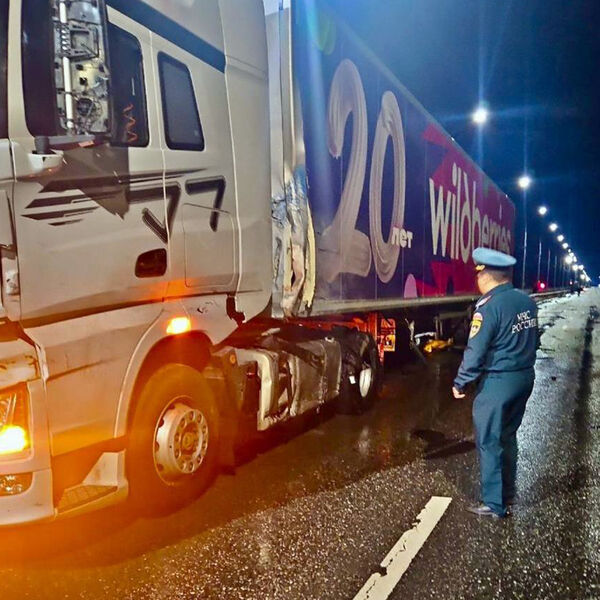 На кадрах с места происшествия видно, что фура вплотную стоит у отбойника. У грузовика почти нет повреждений, а у микроавтобуса вся левая часть полностью разбита.