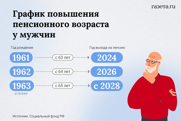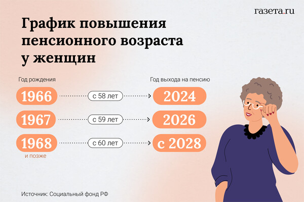 Сейчас идет переходный период: каждый год возраст выхода на пенсию сдвигается на полгода. Продлится все это до 2028-го. В 2024 году на пенсию вышли 58-летние женщины и 63-летние мужчины. К 2028 году планку повысят до 60 и 65 лет.