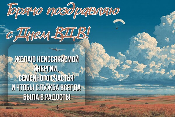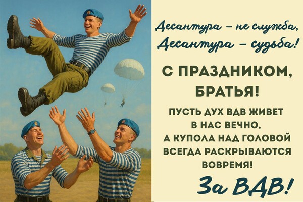 - С Днем ВДВ! Пусть небо дарит тебе свободу, а друзья будут такими же надежными, как стропы твоего парашюта!