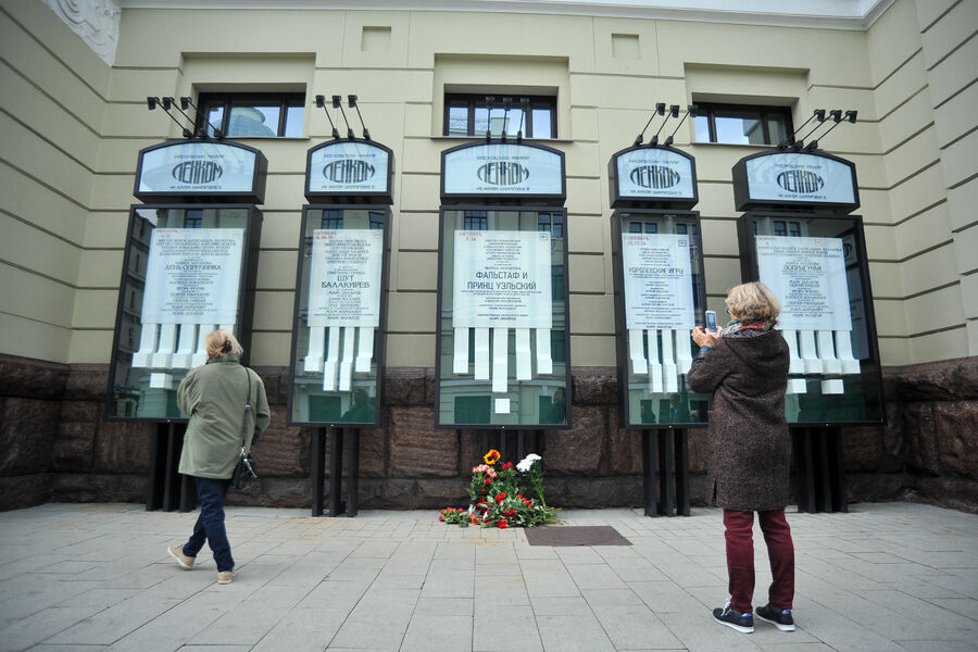 Цветы в память о режиссере М. Захарове у входа в театр «Ленком», 28 сентября 2019 года