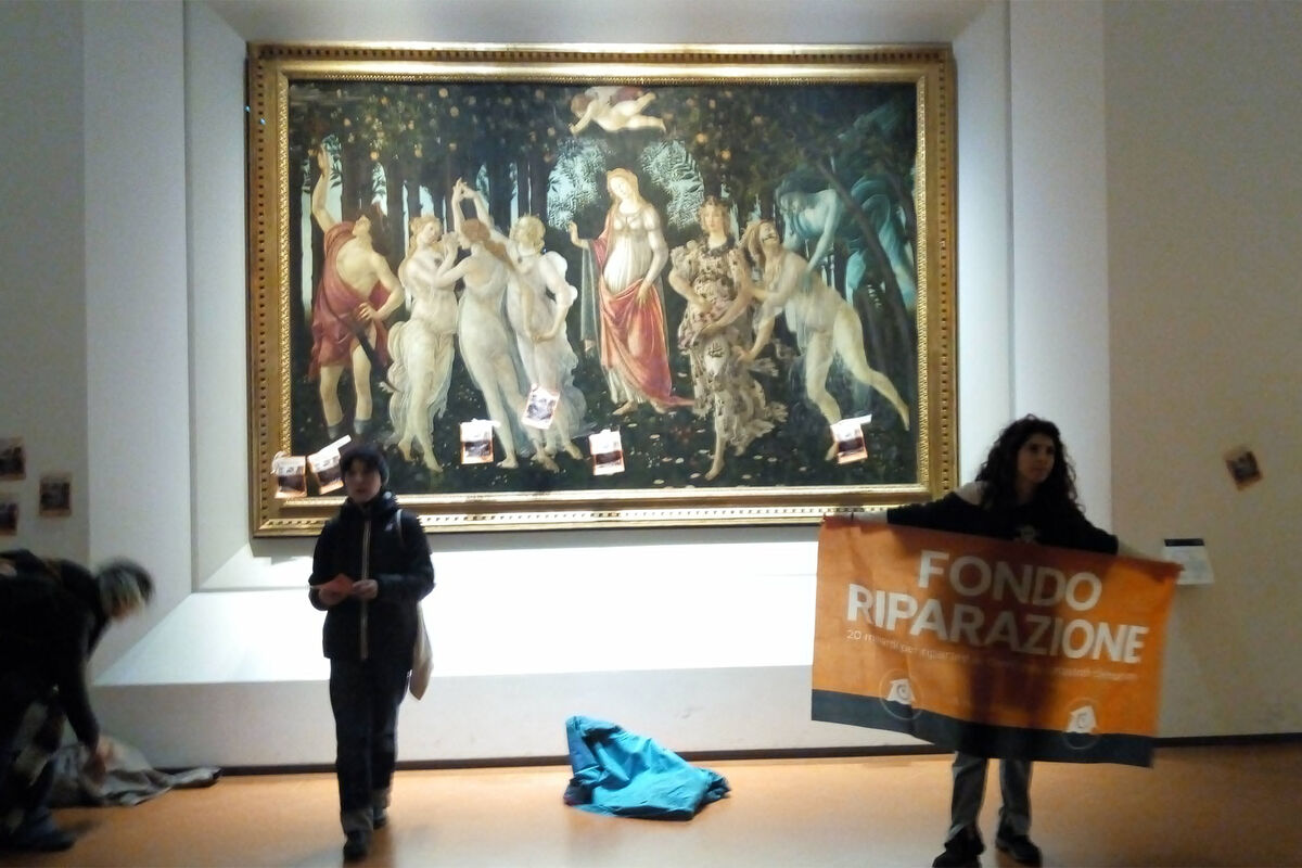Молодые люди прикрепили манифесты с фотографиями наводнения, которое произошло в 2023 году в Тоскане, на защитный экран картины и стены зала. Другую группу полиция задержала еще до выступления, отметили в газете.