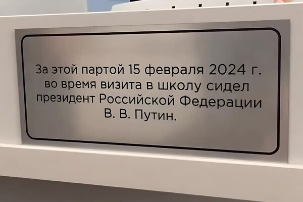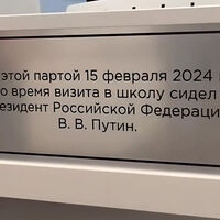 Табличка появилась на одной из парт в кабинете физики школы №32 Нижнего Тагила. Ее установкой руководство образовательного учреждения решило увековечить визит главы государства в город в феврале 2024 года. 12 апреля отремонтированную школу, которую успел двумя месяцами ранее осмотреть президент, показали депутатам законодательного собрания Свердловской области.