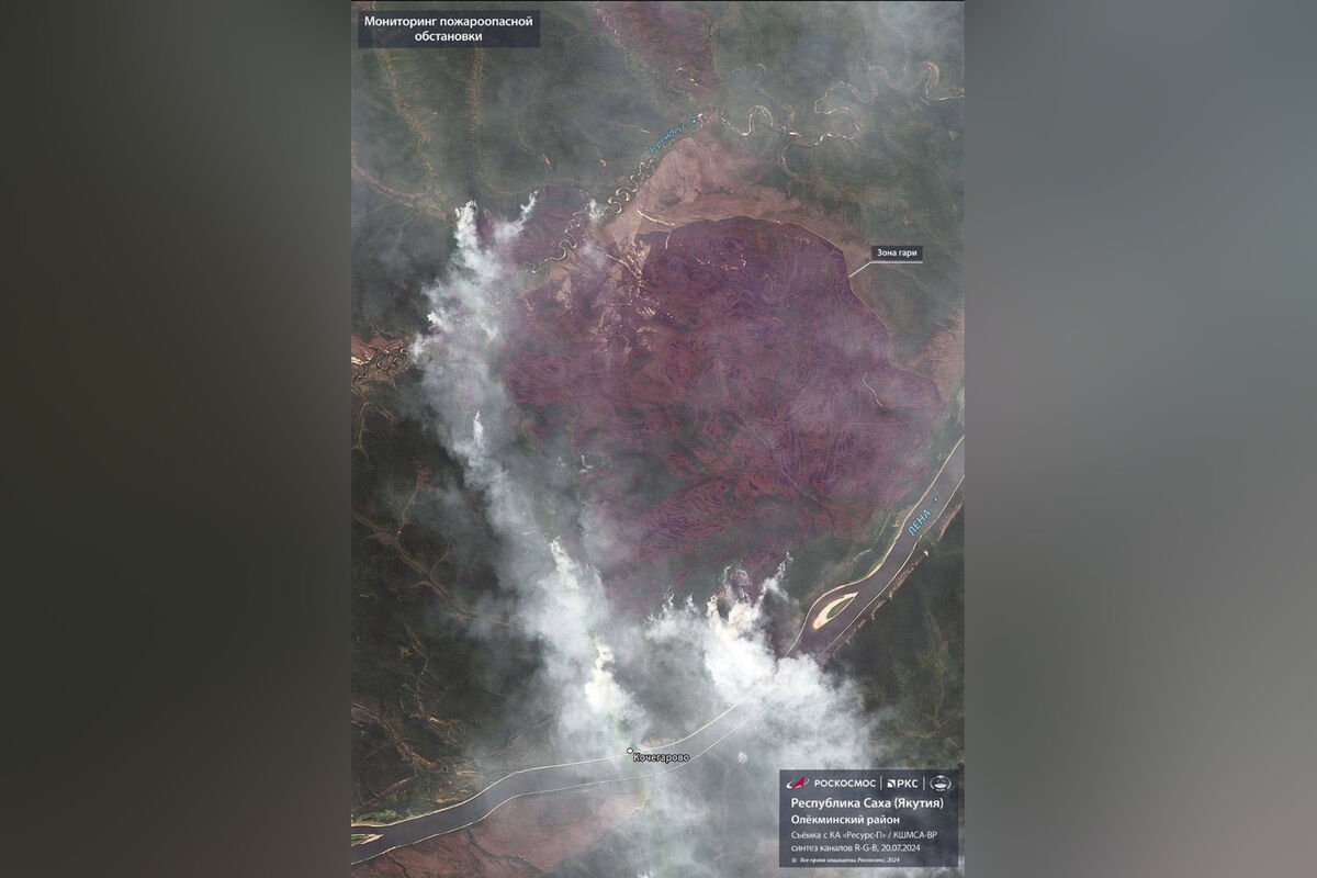 Густой дым окутал часть территории Якутии на сделанной из космоса спутником фотографии лесных пожаров. Изображение опубликовано в Telegram-канале «Роскосмоса».