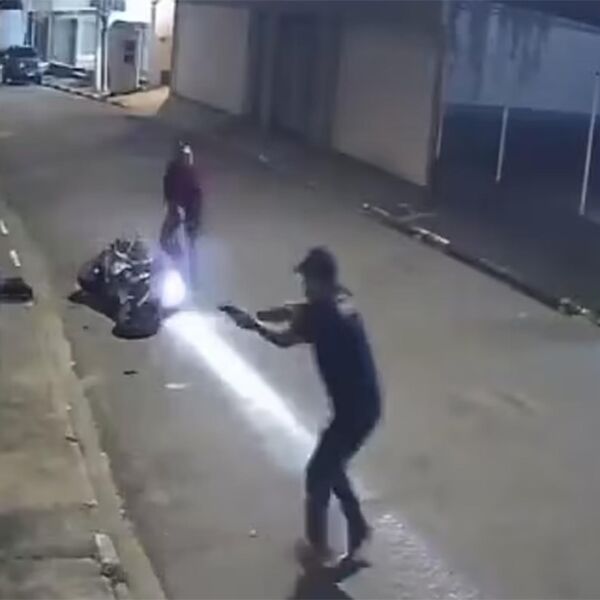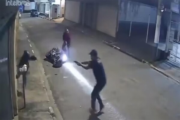 Инцидент, попавший на камеру видеонаблюдения, произошел вечером 4 августа в городе Гуарульюс на юго-востоке страны. На записи видно, как местный житель попрощался со своим знакомым и пошел в противоположном от него направлении. В этот момент двое молодых людей подъехали к мужчине на мотоцикле и затормозили.